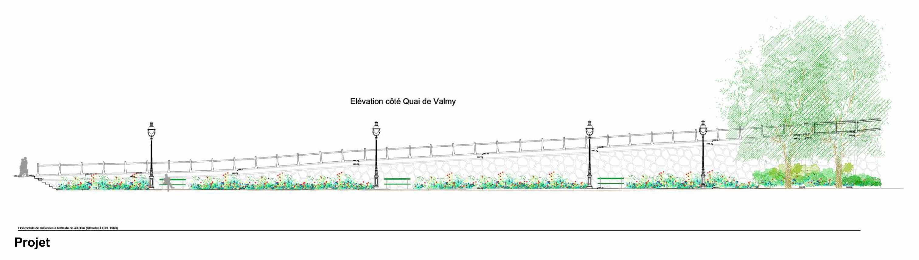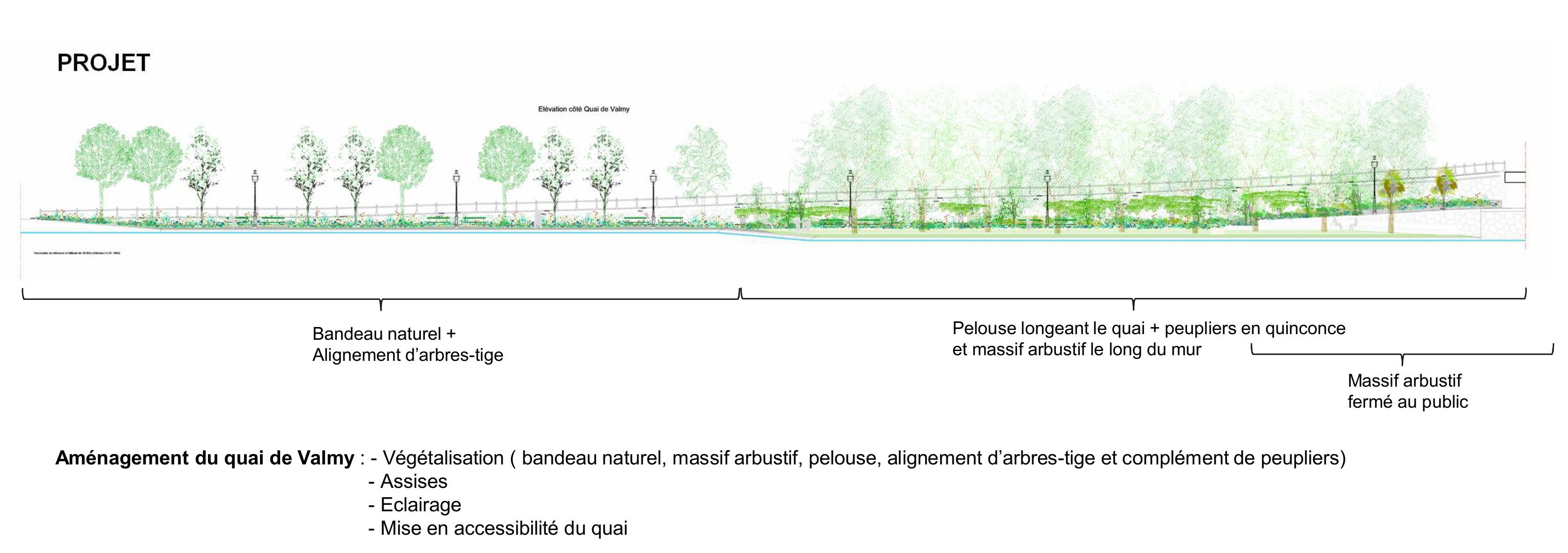 Création de 1 000 m2 de zones végétales : cet aménagement paysager, constitué notamment de pelouse et d'arbustes qui contribueront au renforcement de la biodiversité, inclura la plantation de 27 arbres et la création de bandeaux végétaux le long des murs de soutènement sur les deux quais (Jemmapes et Valmy) ;