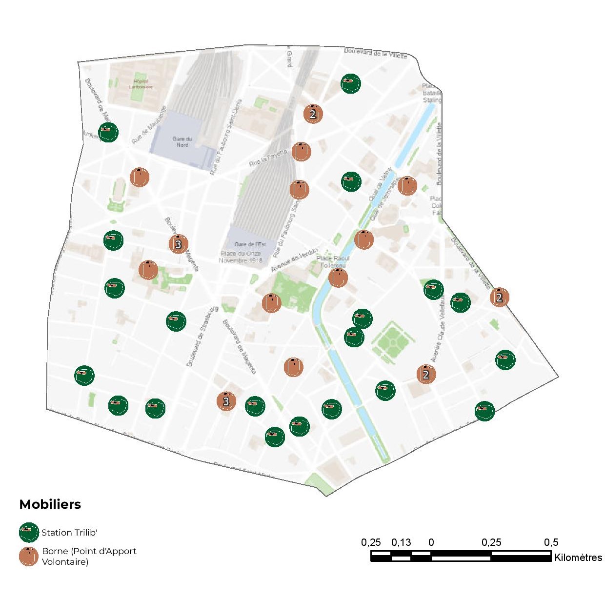 Dans le 10e arrondissement, on compte aujourd'hui un total de 41 bornes installées dans l'espace public, ce qui représente un taux de couverture de 86 % de la surface bâtie (contre 63 % à l'échelle parisienne), conformément à la volonté de la Ville de Paris d'offrir à chaque habitant un point d'apport volontaire situé à moins de trois minutes à pied de son domicile. Et ça paye : entre 2024 et 2025, les quantités collectées dans tout Paris ont augmenté de 20 % !