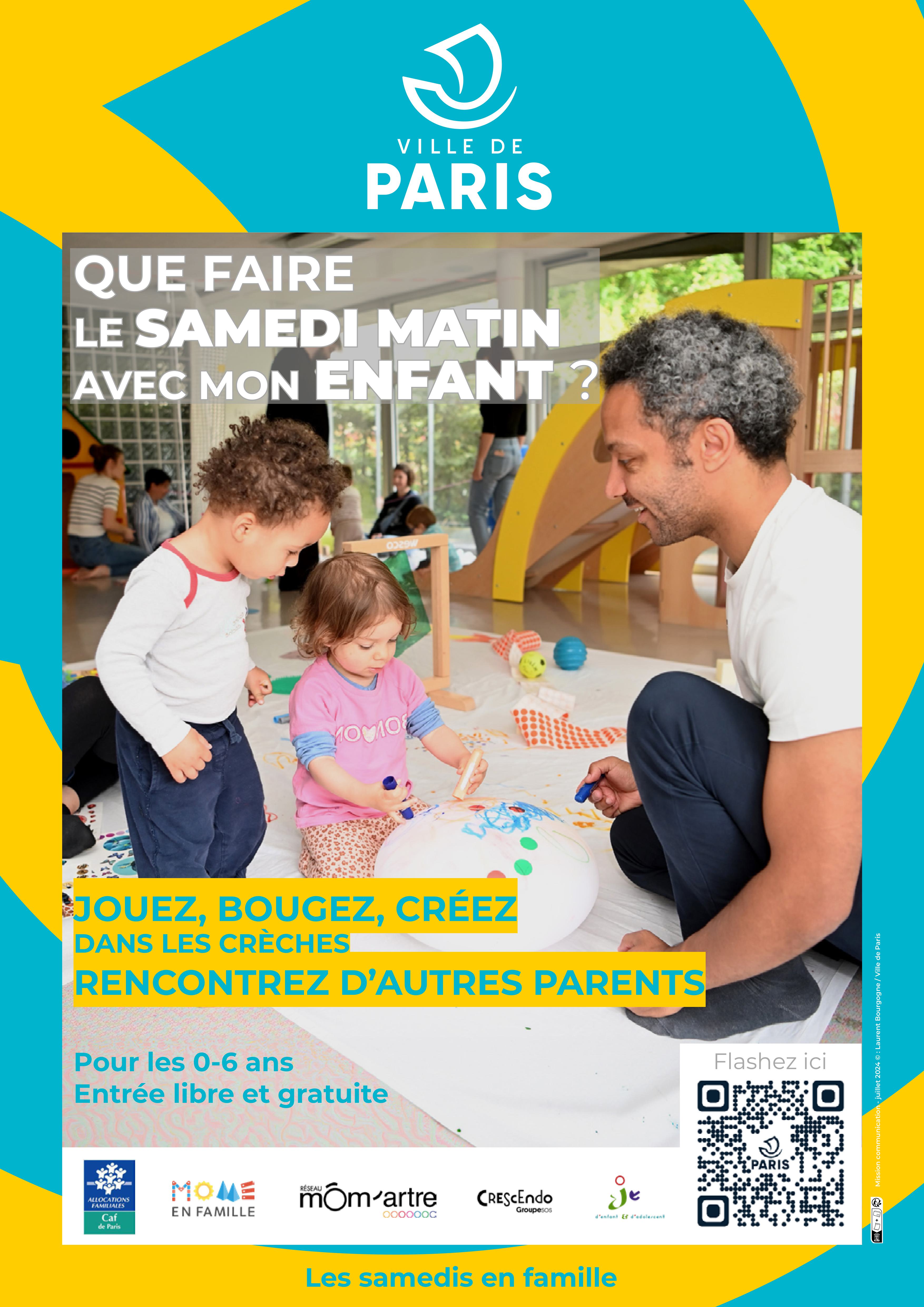 Le dispositif des « Samedis en famille » vise à favoriser la place des familles dans la ville, et leur ouvre ainsi les portes de plusieurs crèches parisiennes le samedi matin pour leur proposer de multiples activités gratuites (ateliers d'éveil artistique, ludique, musical et corporel) destinées aux enfants de 0 à 6 ans.