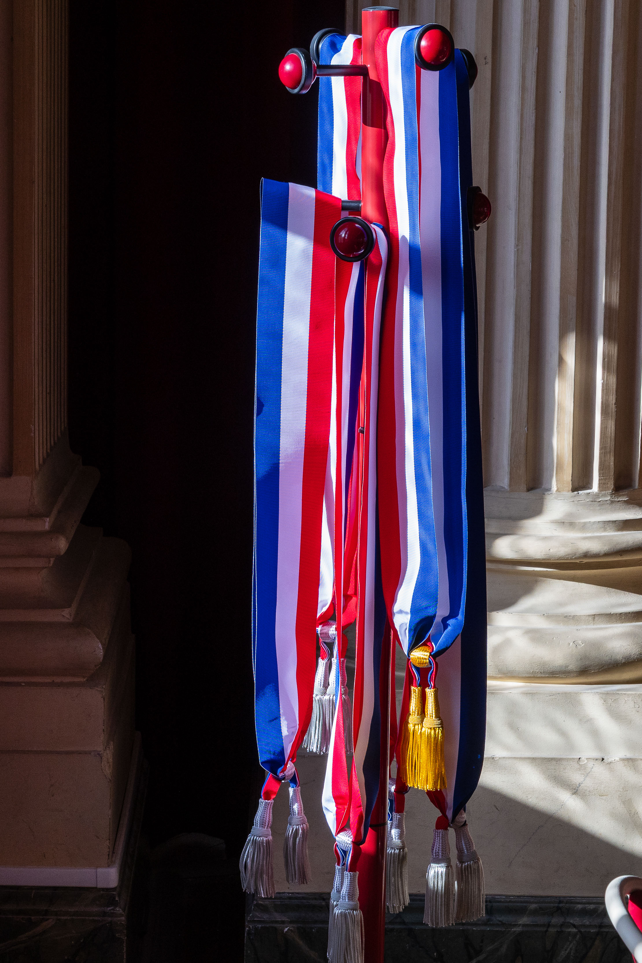 revêt l’écharpe tricolore, qui lui est traditionnellement remise par le doyen