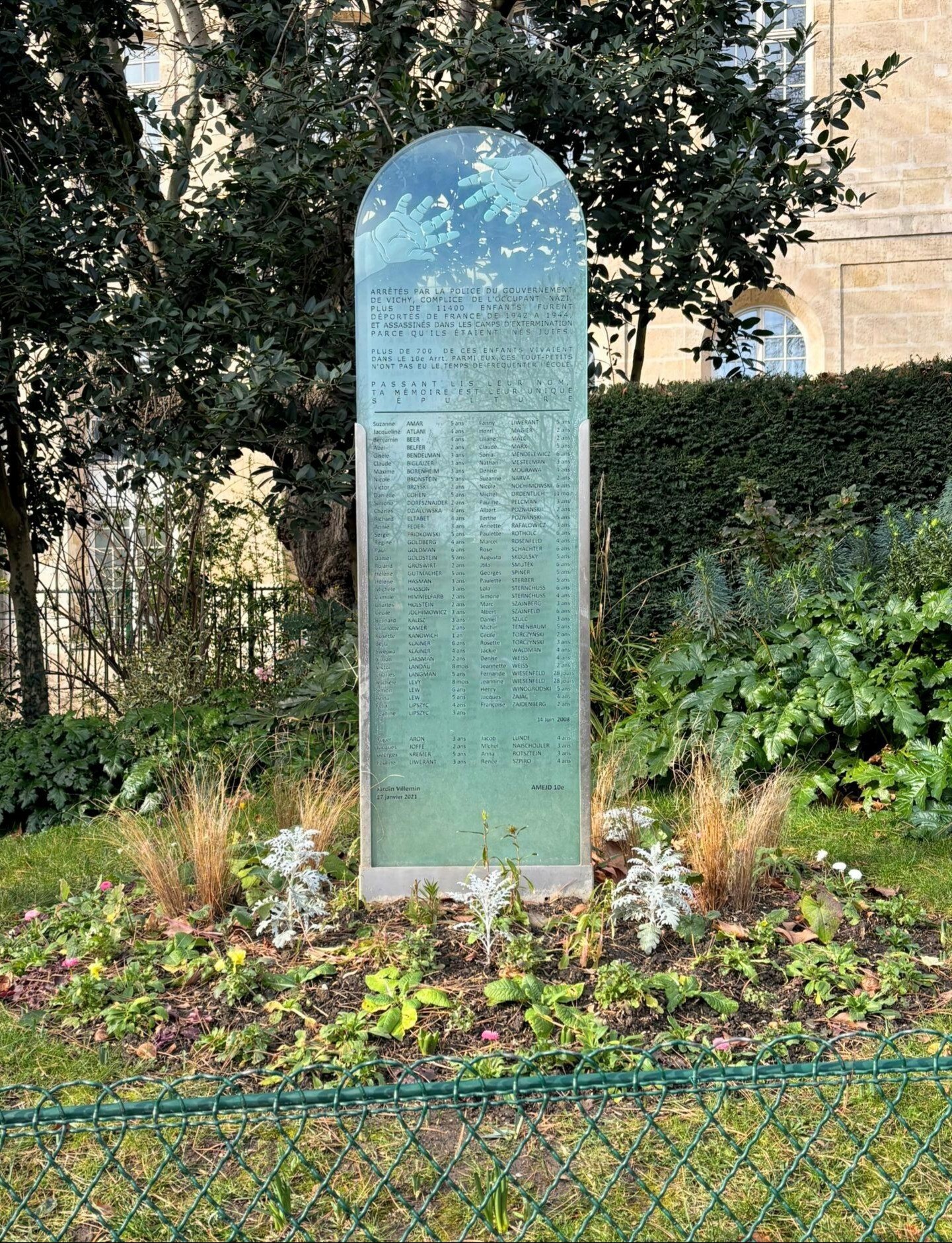 C’est pour préserver leur mémoire que, chaque année durant la semaine du 27 janvier, la Mairie du 10e et l’Association pour la mémoire des enfants juifs déportés (AMEJD) du 10e organisent des cérémonies dans les écoles, collèges et lycées de l'arrondissement comportant une plaque commémorative qui rappelle les noms et les âges des enfants et adolescents juifs assassinés pendant la Seconde Guerre mondiale.