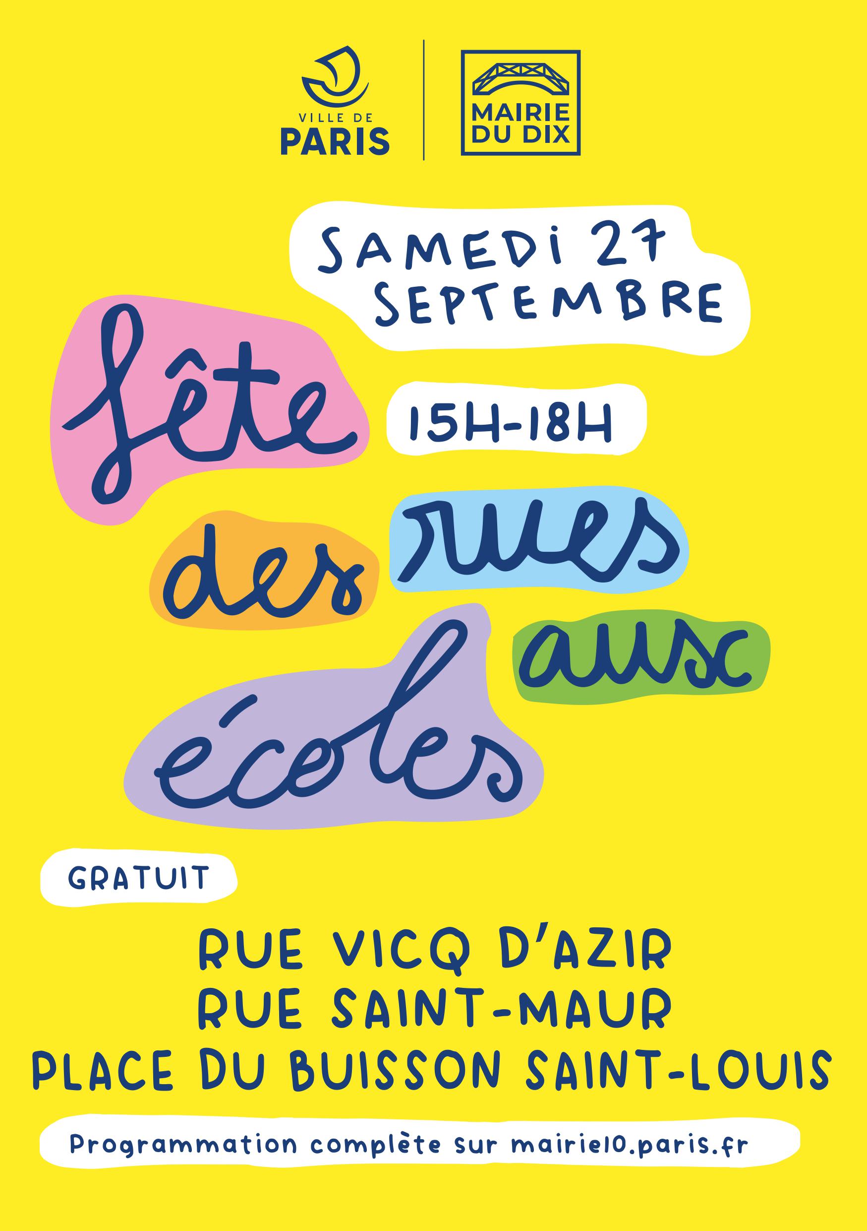 Venez profiter en famille de nombreuses animations gratuites à l'occasion de la 2e édition de la Fête des rues aux écoles ! Rendez-vous rue Saint-Maur, place du Buisson Saint-Louis et rue Vicq d'Azir le samedi 27 septembre, de 15h à 18h.