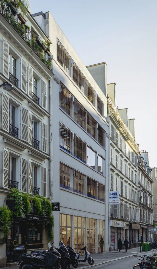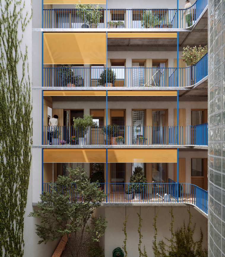 Les logements bénéficieront d’un double système d’occultation, combinant persiennes en bois et stores textiles. Les coursives et les balcons, traités en dalles de terre cuite, prolongeront naturellement les espaces intérieurs vers l’extérieur avec des garde-corps en métal laqué bleu pour apporter une touche contemporaine. L’escalier sera encloisonné en pavés de verre pour pouvoir jouir d'un éclairage naturel, et l’ascenseur s’intégrera discrètement dans un noyau en béton peint dans la même teinte de la façade.