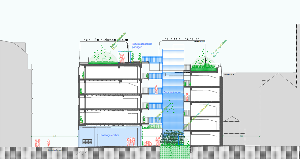 Pour contribuer au confort quotidien des habitants et favoriser la convivialité, le projet inclut la création d'une cour végétalisée au centre du complexe, qui offrira 30 m2 de végétation de pleine terre. En complément, conformément aux dispositions du Plan local d'urbanisme bioclimatique de la Ville de Paris, le bâtiment sera doté d'une toiture végétalisée de plus de 180 m2.