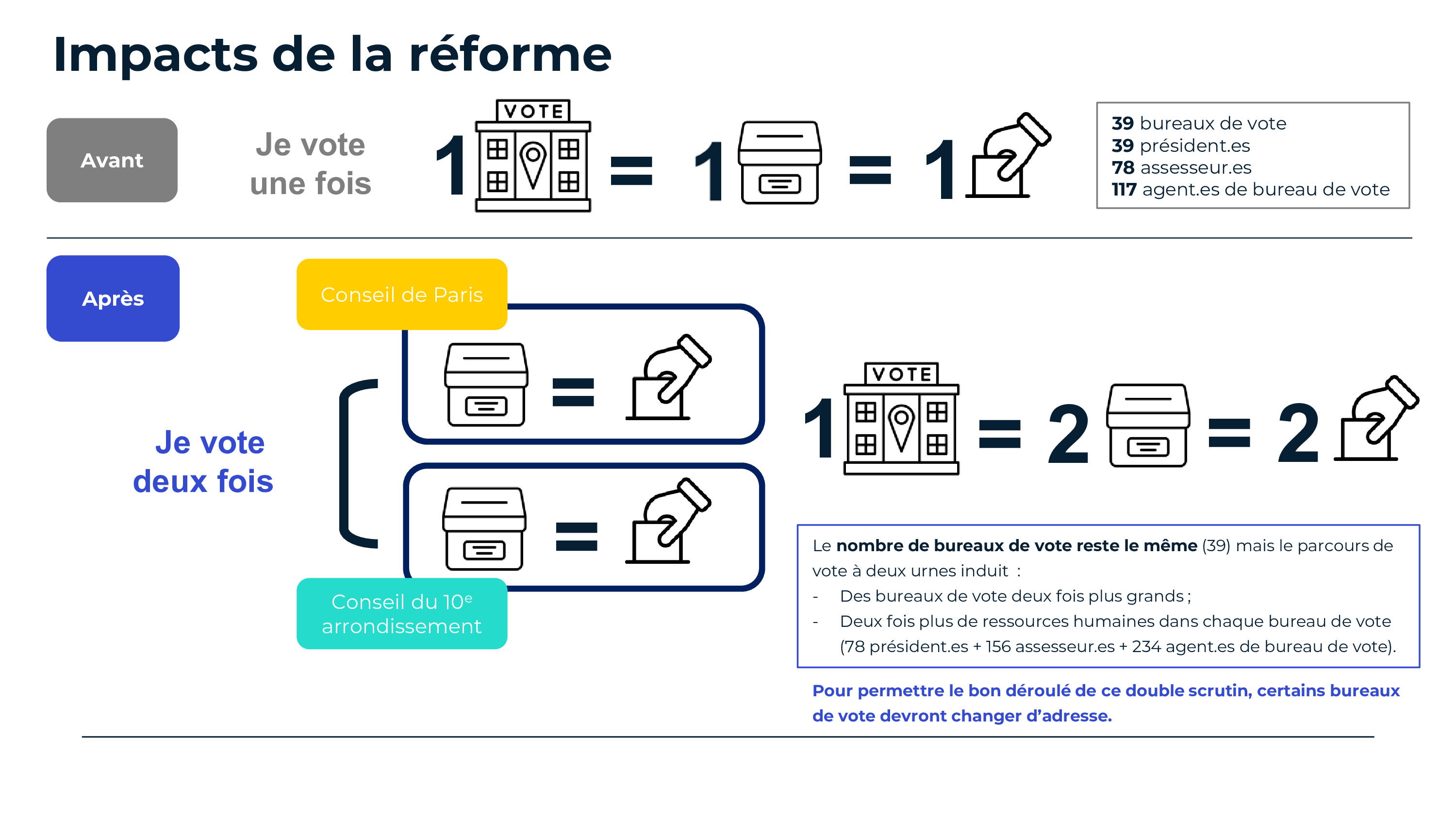 L'organisation de ce nouveau mode de scrutin à deux urnes nécessite le dédoublement des bureaux de vote, chaque bureau actuel devant être scindé en deux : l'un dédié à la liste d'arrondissement et l'autre à la liste centrale de la Ville de Paris.