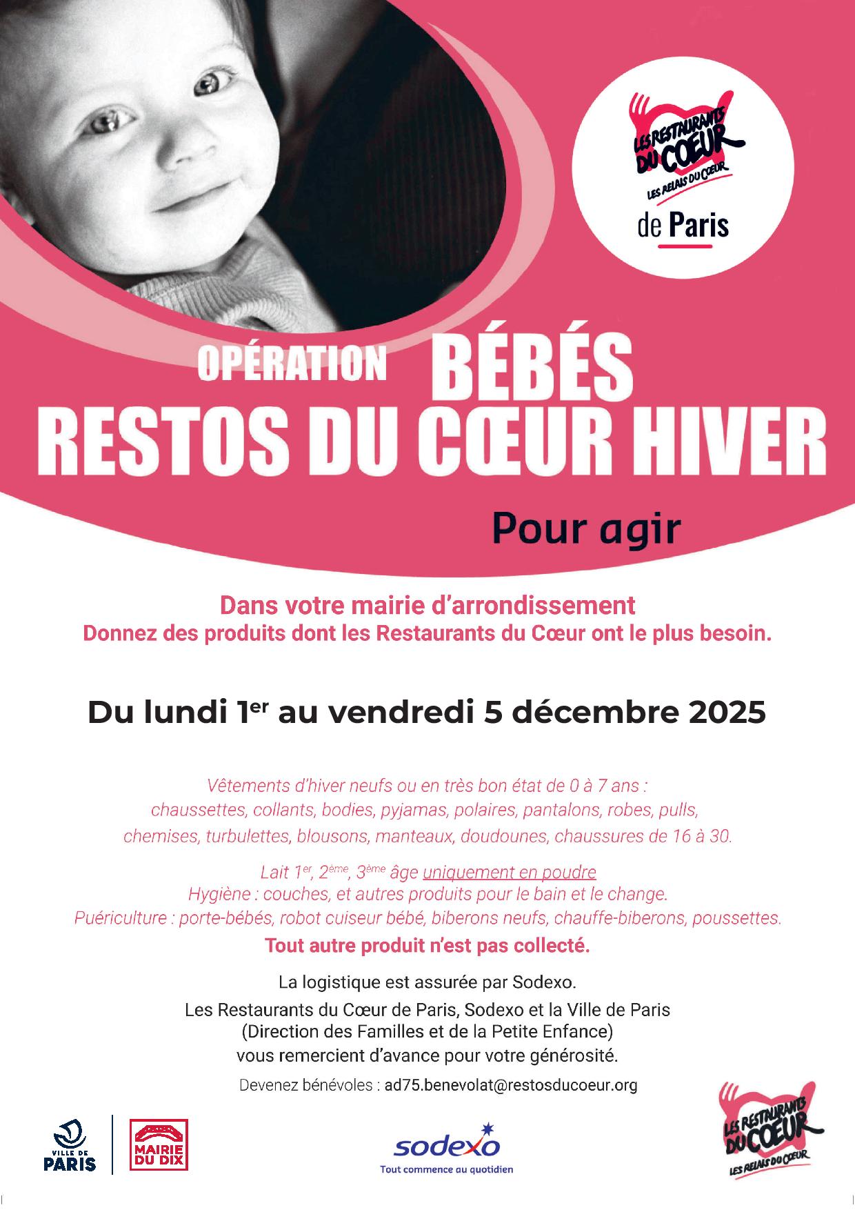 Dans le cadre de la 17e édition de la campagne « Restos Bébés du Cœur », la Ville de Paris et la Mairie du 10e s’engagent aux côtés des Restos du Cœur et de la société Sodexo, du lundi 1er au vendredi 5 décembre 2025, afin de venir en aide aux familles dans le besoin.